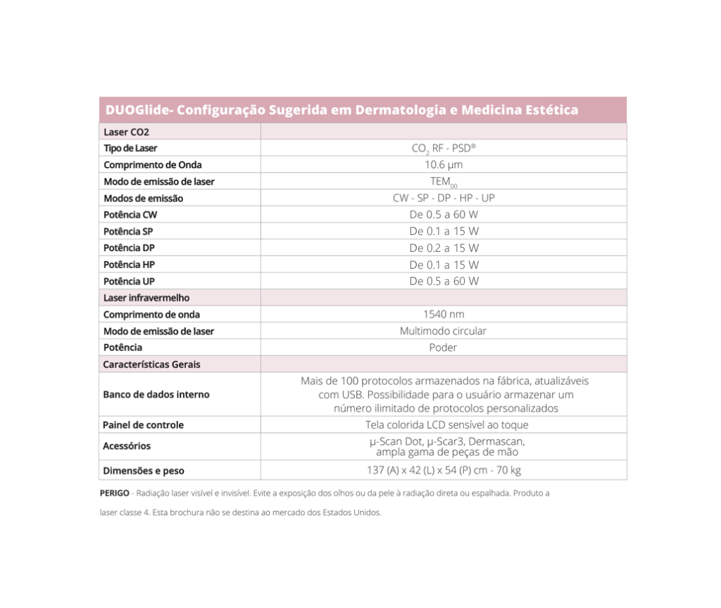 Eleito o melhor equipamento a laser de CO2 hibrido do mundo pelo AMWC 2023 o DUOGLIDE possui uma tecnologia revolucionaria que apresenta um duplo comprimento de onda combinando CO2 e 1540 nm, possibilitando o operador uma grande versatilidade de tratamentos ablativos e nao ablativos num só dispositivo.